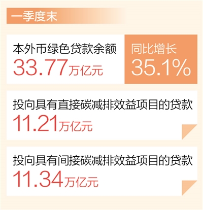 本报北京5月19日电(记者吴秋余)近日,中国人民银行发布最新数据显示:今年一季度,我国绿色贷款保持高速增长,截至一季度末,本外币绿色贷款余额33.77万亿元,同比增长35.1%,高于各项贷款增速25.9个百分点,一季度增加3.7万亿元,季度增量创历史新高。其中,投向具有直接和间接碳减排效益项目的贷款分别为11.21万亿元和11.34万亿元,合计占绿色贷款的66.8%。